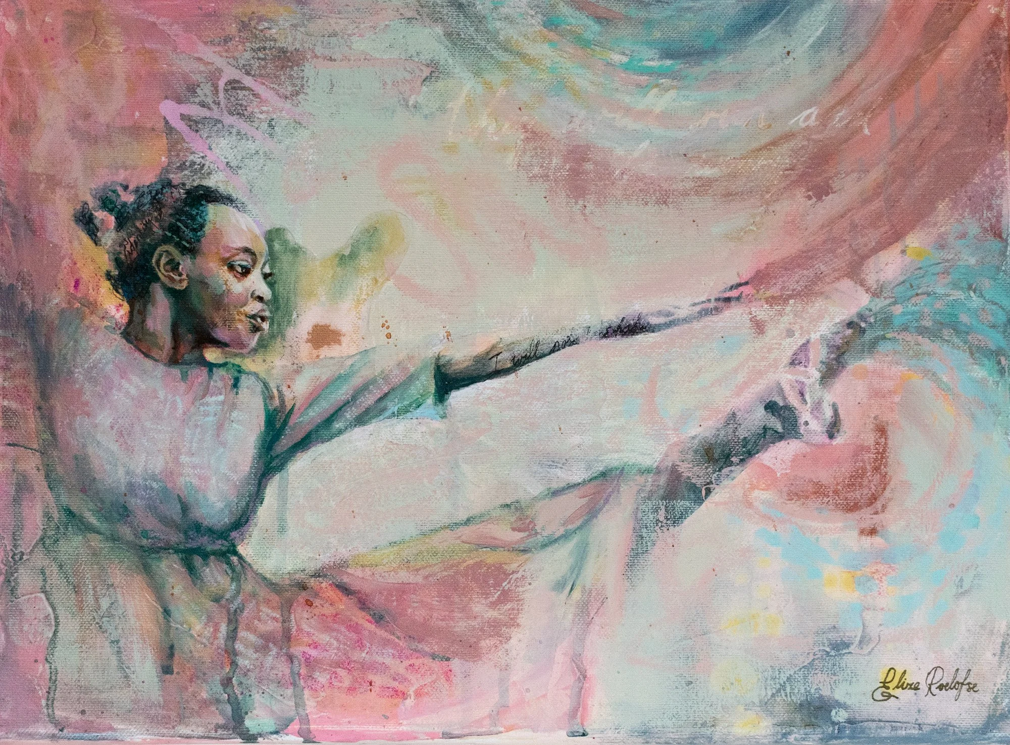 The painting itself was created through a spontaneous play of paint splashes and abstraction, allowing the movement of paint to mirror the dancer’s momentum. Within the broader Rhythm of Hope series, this work reflects how perseverance often emerges in unpredictable circumstances — and how resilience, once set in motion, can begin to reshape the very world it moves through.